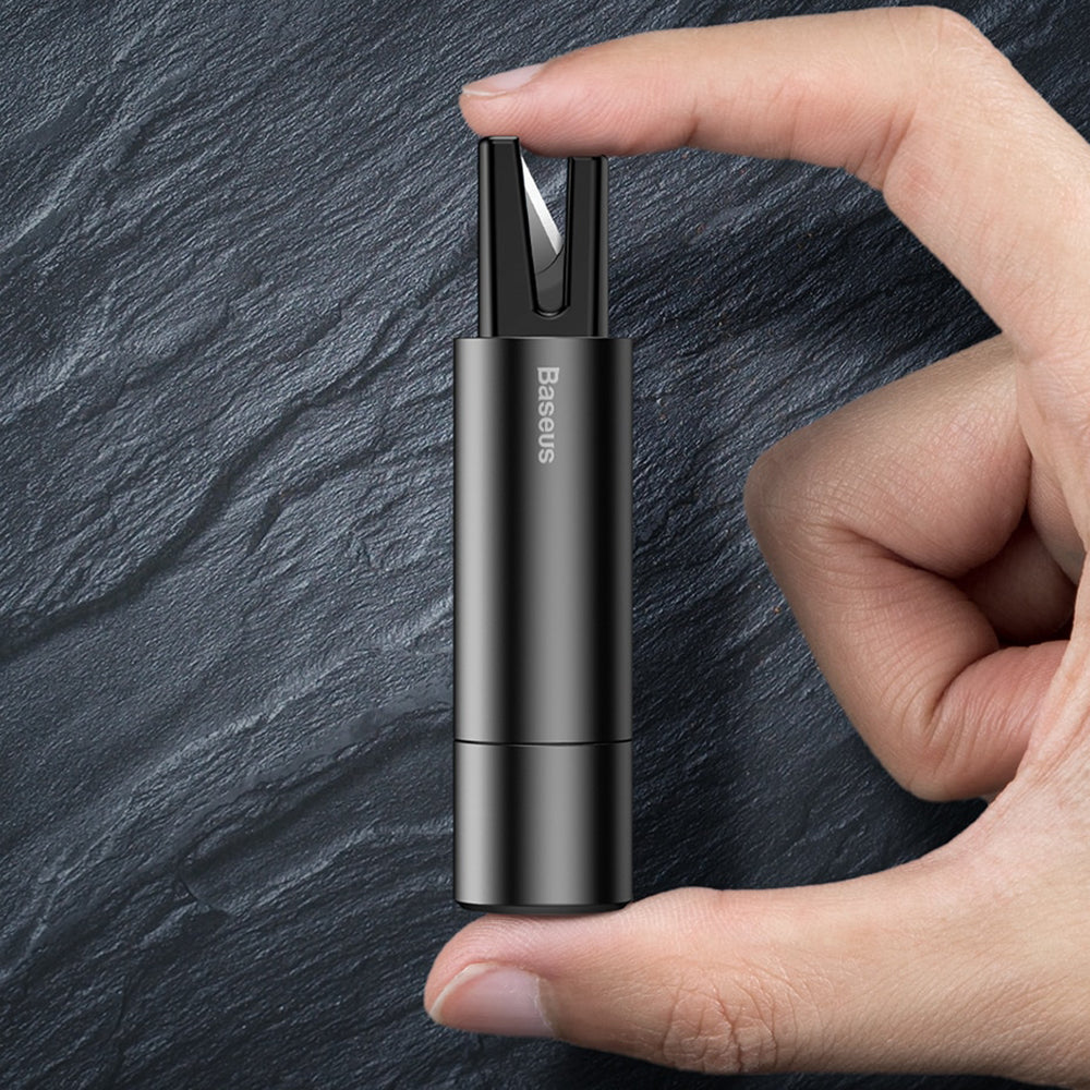 Inuti enheten finns ett mycket skarpt blad för snabb skärning av säkerhetsbälten vid en olycka.