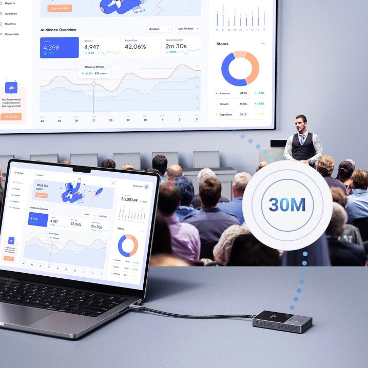 medan mottagaren enkelt ansluts via HDMI och USB-A till din skärm. Oavsett om du vill projicera en film på TV, göra professionella presentationer